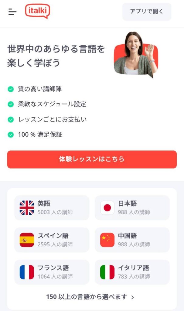 italkiは「自分に合う先生とじっくり学びたい」「スキマ時間に会話練習したい」という人にぴったりのサービスです。初めてでも安心して試せるトライアルレッスンがあり、気軽に始められるのも魅力。