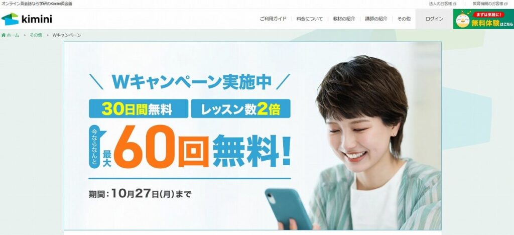 2025年10月現在、30日間無料体験&レッスン数2倍キャンペーン(10/27まで)を開催中!今こそ、お得にKiminiを始めませんか?
